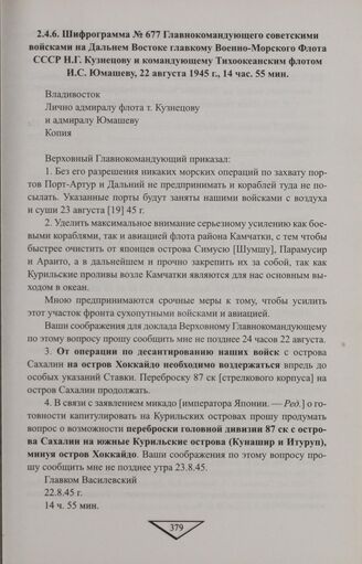 Шифрограмма № 677 Главнокомандующего советскими войсками на Дальнем Востоке главкому Военно-Морского Флота СССР Н.Г. Кузнецову и командующему Тихоокеанским флотом И.С. Юмашеву, 22 августа 1945 г., 14 час. 55 мин.
