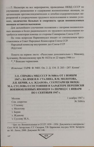 Справка МВД СССР № 5686/к от 1 ноября 1947 г. на имя И.В. Сталина, В.М. Молотова, Л.П. Берии, А.А. Жданова, секретаря ЦК ВКП(б) М.А. Суслова о состоянии и характере переписки военнопленных японцев за период с 1 января по 1 сентября 1947 г.