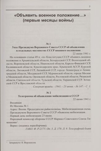 Указ Президиума Верховного Совета СССР об объявлении в отдельных местностях СССР военного положения. 22 июня 1941 г. // Северная правда. 1941. 23 июня. № 147. С. 1.