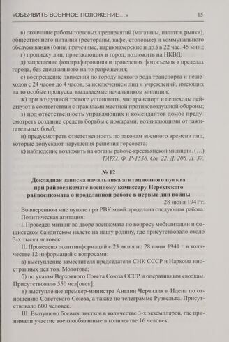 Докладная записка начальника агитационного пункта при райвоенкомате военному комиссару Нерехтского райвоенкомата о проделанной работе в первые дни войны. 28 июня 1941 г. // ГАНИКО. Ф. Р-22. Оп. 1. Д. 622. Л. 46.