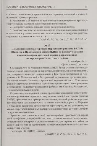 Докладная записка секретаря Нерехтского райкома ВКП(б) Шиляева в Ярославский обком ВКП(б) по вопросу оказания помощи в охране железной дороги, расположенной на территории Нерехтского района. 8 сентября 1941 г. // ГАНИКО. Ф. Р-22. Оп. 1. Д. 622. Л. 51.