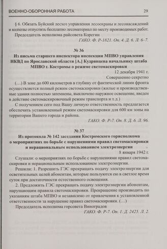 Из протокола № 142 заседания Костромского горисполкома о мероприятиях по борьбе с нарушениями правил светомаскировки и нерациональным использованием электроэнергии. 8 января 1942 г. // ГАКО. Ф. P-7. Оп. 1. Д. 2425. Л. 2.