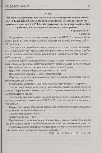 Из письма директора костромского машиностроительного завода им. Л.Б. Красина С.А. Костенина Народному комиссару резиновой промышленности СССР Т.Б. Митрохину о пересмотре количества рабочих, посылаемых на военно-полевые работы. 18 октября 1941 г. // ГАКО. Ф. Р-837. Оп. 3. Д. 35. Л. 114.