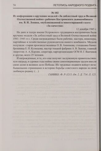 Из информации о вручении медалей «За доблестный труд в Великой Отечественной войне» рабочим Костромского льнокомбината им. В.И. Ленина, опубликованной в многотиражной газете «За качество». 12 декабря 1945 г. // ГАНИКО. Ф. Р-3215. Оп. 2. Д. 714. Л. 121.