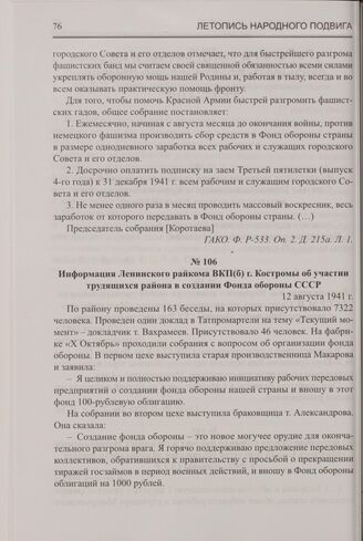 Информация Ленинского райкома ВКП(б) г. Костромы об участии трудящихся района в создании Фонда обороны СССР. 12 августа 1941 г. // ГАНИКО. Ф. Р-2. Оп. 1. Д. 653. Л. 10.