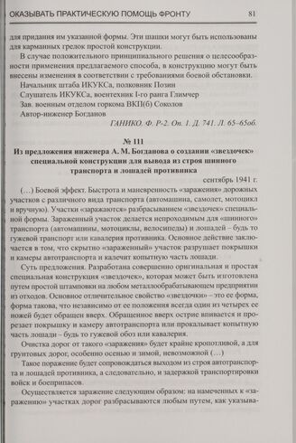 Из предложения инженера А.М. Богданова о создании «звездочек» специальной конструкции для вывода из строя шинного транспорта и лошадей противника. Сентябрь 1941 г. // ГАНИКО. Ф. Р-2. Оп. 1. Д. 741. Л. 69-69об.