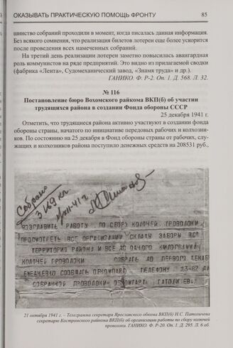 Постановление бюро Вохомского райкома ВКП(б) об участии трудящихся района в создании Фонда обороны СССР. 25 декабря 1941 г. // ГАНИКО. Ф. Р-205. Оп. 1. Д. 811. Л. 149-150.