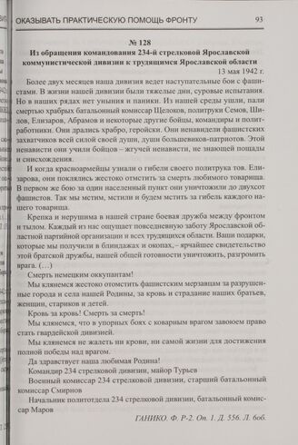 Из обращения командования 234-й стрелковой Ярославской коммунистической дивизии к трудящимся Ярославской области. 13 мая 1942 г. // ГАНИКО. Ф. Р-2. Оп. 1. Д. 556. Л. 6об.