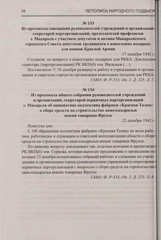 Из протокола общего собрания руководителей учреждений и организаций, секретарей первичных парторганизаций г. Макарьев об инициативе коллектива фабрики «Красная Талка» о сборе средств на строительство авиоэскадрильи имени товарища Фрунзе. 22 декабря 1942 г. // ГАКО. Ф. P-533. Оп. 2. Д. 225. Л. 8.