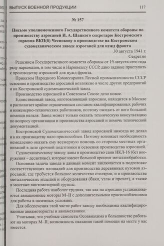 Письмо уполномоченного Государственного комитета обороны по производству аэросаней И.А. Шацкого секретарю Костромского горкома ВКП(б) Чеснокову о производстве на Костромском судомеханическом заводе аэросаней для нужд фронта. 30 августа 1941 г. // ГАНИКО. Ф. Р-2. Оп. 1. Д. 615. Л. 79-79об.