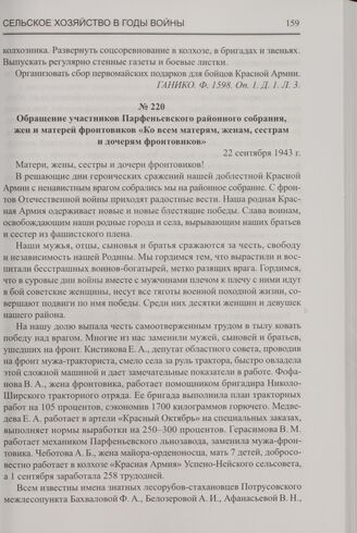 Обращение участников Парфеньевского районного собрания, жен и матерей фронтовиков «Ко всем матерям, женам, сестрам и дочерям фронтовиков». 22 сентября 1943 г.