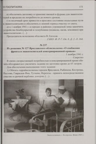 Из решения № 127 Ярославского облисполкома «О снабжении фронта и эвакогоспиталей консервированной кровью». 1 ноября 1941 г. // ГАКО. Ф. Р-7. Оп. 8. Д. 2. Л. 168.