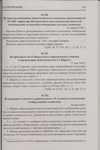 Из решения Галичского райисполкома «О готовности помещений и оборудование госпиталя». 30 мая 1942 г. // ГАКО. Ф. Р-2161. Оп. 3. Д. 103. Л. 26.