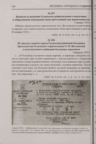 Из письма главного врача Галичской районной больницы председателю Галичского горисполкома О.М. Жестовской о недостаточном снабжении больницы керосином. 7 февраля 1943 г. // ГАКО. Ф. Р-2161. Оп. 3. Д. 122. Л. 10-10об.