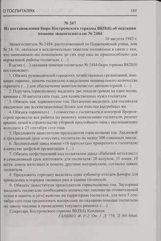 Из постановления бюро Костромского горкома ВКП(б) об оказании помощи эвакогоспиталю № 2484. 30 августа 1943 г. // ГАНИКО. Ф. Р-2. Оп. 1. Д. 759. Л. 60-60об.