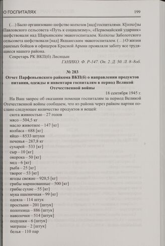 Отчет Парфеньевского райкома ВКП(б) о направлении продуктов питания, одежды и инвентаря госпиталям в период Великой Отечественной войны. 18 сентября 1945 г. // ГАНИКО. Ф. Р-765. Оп. 1. Д. 475. Л. 73.