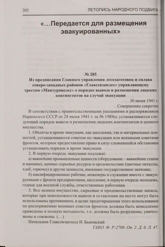 Из предписания Главного управления лесозаготовок и сплава северо-западных районов «Главсевзаплес» управляющему трестом «Мантуроволес» о порядке вывоза и размещения людских контингентов на случай эвакуации. 30 июня 1941 г. // ГАКО. Ф. Р-2700. Оп. 2. Д. 6. Л. 47.