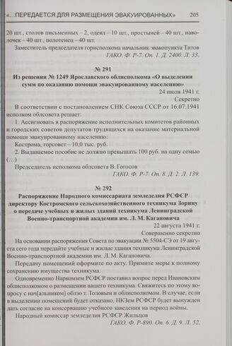 Распоряжение Народного комиссариата земледелия РСФСР директору Костромского сельскохозяйственного техникума Зорину о передаче учебных и жилых зданий техникума Ленинградской Военно-транспортной академии им. Л.М. Кагановича. 22 августа 1941 г. // ГАКО. Ф. P-890. Оп. 6. Д. 9. Л. 52.