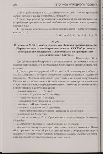Из приказа № 58 Главного управления Льняной промышленности [Наркомата текстильной промышленности] СССР об установке оборудования Смоленского льнокомбината на предприятиях Главльнопрома в г. Костроме. 10 сентября 1941 г. // ГАНИКО. Ф. Р-2. Оп. 1. Д. 615. Л. 82-83.