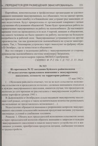 Из протокола № 32 заседания Буйского райисполкома «О недостаточно проявленном внимании к эвакуируемому населению, осевшему на территории района». 15 мая 1942 г. // ГАКО. Ф. Р-1821. Оп. 6. Д. 22. Л. 76об-77.