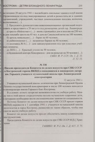 Письмо председателя Комитета по делам искусств при СНК СССР в Костромской горком ВКП(б) о находящихся в пионерском лагере им. Горького учащихся музыкальной школы при Ленинградской консерватории. 12 августа 1941 г. // ГАНИКО. Ф. P-2. Оп. 1. Д. 615. Л. 75.
