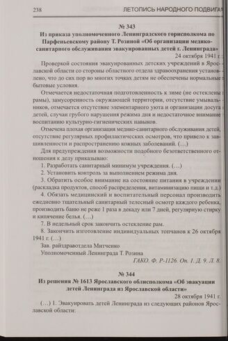 Из приказа уполномоченного Ленинградского горисполкома по Парфеньевскому району Т. Розиной «Об организации медико- санитарного обслуживания эвакуированных детей г. Ленинграда». 24 октября 1941 г. // ГАКО. Ф. Р-1126. Оп. 1. Д. 9. Л. 8.