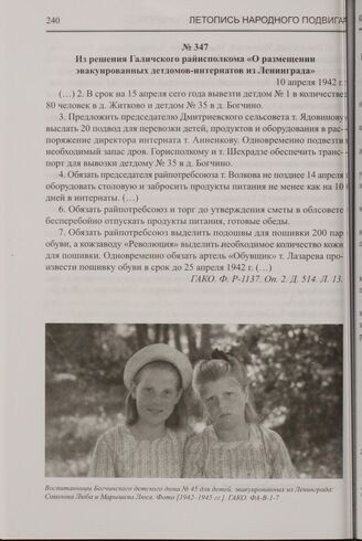 Из решения Галичского райисполкома «О размещении эвакуированных детдомов-интернатов из Ленинграда». 10 апреля 1942 г. // ГАКО. Ф. Р-1137. Оп. 2. Д. 514. Л. 13.