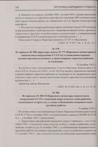 Из приказа № 300-М Народного комиссара минометного вооружения СССР о снижении норм отпуска хлеба рабочим, осужденным за прогулы, а также отбывавшим исправительно- трудовые работы. 9 ноября 1942 г. // ГАКО. Ф. Р-884. Оп. 3. Д. 13. Л. 9.