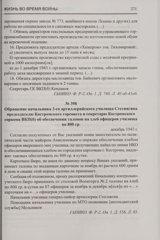 Обращение начальника 3-го артиллерийского училища Стеснягина председателю Костромского горсовета и секретарю Костромского горкома ВКП(б) об обеспечении талонов на хлеб офицеров училища по 800 гр. Декабрь 1943 г.
