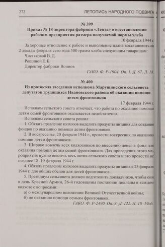Из протокола заседания исполкома Марушинского сельсовета депутатов трудящихся Ивановского района об оказании помощи детям фронтовиков. 17 февраля 1944 г. // ГАКО. Ф. P-2490. Оп. 3. Д. 122. Л. 18-19об.