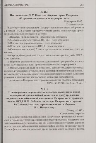 Постановление № 27 Комитета обороны города Костромы «О противоэпидемических мероприятиях». 18 февраля 1942 г.