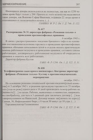 Телефонограмма санитарного инспектора г. Костромы директору фабрики «Ременная тесьма» Кустову о противоэпидемических мероприятиях. Октябрь 1943 г. // ГАКО. Ф. P-1286. Оп. 1. Д. 322. Л. 40.
