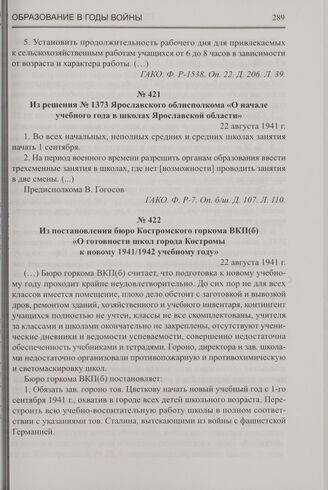 Из постановления бюро Костромского горкома ВКП(б) «О готовности школ города Костромы к новому 1941/1942 учебному году». 22 августа 1941 г. // ГАНИКО. Ф. Р-2. Оп. 1. Д. 611. Л. 51-51об.