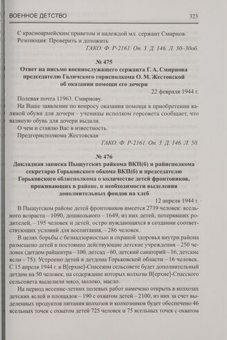 Ответ на письмо военнослужащего сержанта Г.А. Смирнова председателю Галичского горисполкома О.М. Жестовской об оказании помощи его дочери. 22 февраля 1944 г. // ГАКО. Ф. Р-2161. Оп. 3. Д. 146. Л. 50.
