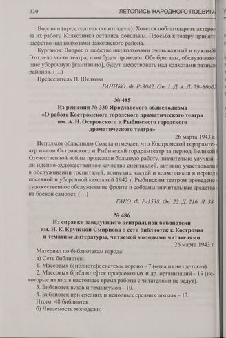Из решения № 330 Ярославского облисполкома «О работе Костромского городского драматического театра им. А.Н. Островского и Рыбинского городского драматического театра». 26 марта 1943 г. // ГАКО. Ф. Р-1538. Оп. 22. Д. 216. Л. 38.