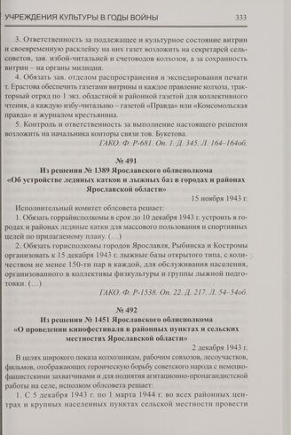 Из решения № 1389 Ярославского облисполкома «Об устройстве ледяных катков и лыжных баз в городах и районах Ярославской области». 15 ноября 1943 г. // ГАКО. Ф. Р-1538. Оп. 22. Д. 217. Л. 54-54об.