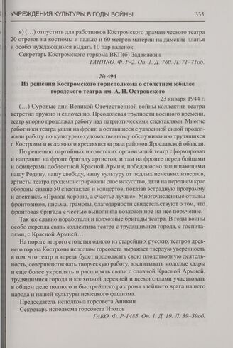 Из решения Костромского горисполкома о столетнем юбилее городского театра им. А.Н. Островского. 23 января 1944 г. // ГАКО. Ф. P-1485. Оп. 1. Д. 19. Л. 39-39об.