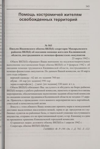 Письмо Ивановского обкома ВКП(б) секретарю Макарьевского райкома ВКП(б) об оказании помощи жителям Калининской области, пострадавшим от немецко-фашистских оккупантов. 25 марта 1942 г. // ГАНИКО. Ф. Р-199. Оп. 1. Д. 782. Л. 122.