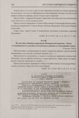 Из жалобы общины прихожан Покровской церкви с. Пема Степановского сельсовета Галичского района в Святейший Синод. 19 июля 1944 г. // ГАКО. Ф. P-2102. Оп. 6. Д. 313. Л. 5об.