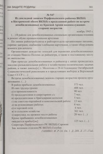 Из докладной записки Парфеньевского райкома ВКП(б) в Костромской обком ВКП(б) о проделанной работе по встрече демобилизованных из Красной Армии военнослужащих старших возрастов. Ноябрь 1945 г. // ГАНИКО. Ф. Р-24. Оп. 1. Д. 289. Л. 17-17об.
