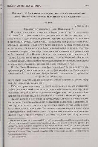 Письмо Н.И. Васильчикова преподавателю Солигаличского педагогического училища П.В. Иванову в г. Солигалич. 2 мая 1942 г. // ГАКО. Ф. Р-1235. Оп. 1. Д. 2. Л. 3-4.