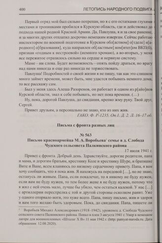Письмо красноармейца М.А. Воробьева семье в д. Слобода Чудского сельсовета Палкинского района. 17 июля 1941 г. // ГАНИКО. Ф. Р-275. Оп. 1. Д. 19. Л. 2-3.