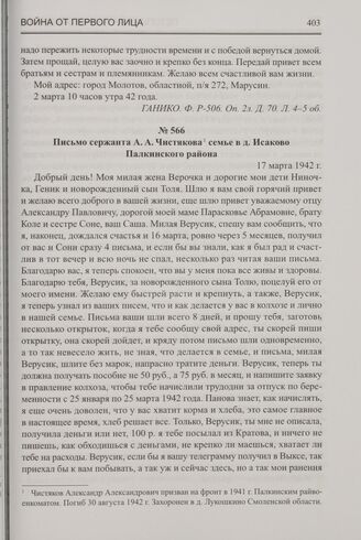 Письмо сержанта А.А. Чистякова семье в д. Исаково Палкинского района. 17 марта 1942 г. // ГАНИКО. Ф. Р-275. Оп. 1. Д. 62. Л. 8-9 об.