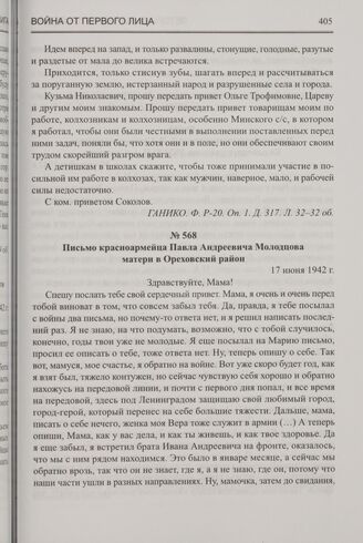 Письмо красноармейца Павла Андреевича Молодцова матери в Ореховский район. 17 июня 1942 г. // ГАНИКО. Ф. Р-506. Оп. 2л. Д. 71. Л. 6-7.