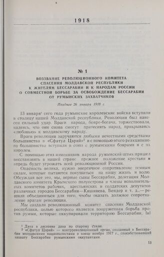Воззвание революционного комитета спасения Молдавской республики к жителям Бессарабии и к народам России о совместной борьбе за освобождение Бессарабии от румынских захватчиков. Позднее 26 января 1918 г.