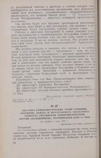 Листовка коммунистических групп Румынии, Буковины, Баната и Бессарабского областного комитета Российской Коммунистической партии (большевиков), посвященная дню 1-е Мая. Не позднее 1 мая 1921 г.