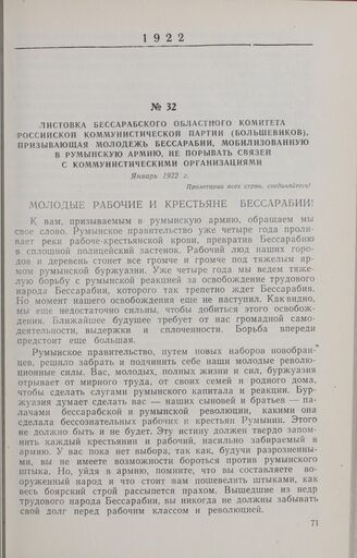 Листовка Бессарабского областного комитета Российской Коммунистической партии (большевиков), призывающая молодежь Бессарабии, мобилизованную в румынскую армию, не порывать связи с коммунистическими организациями. Январь 1922 г.