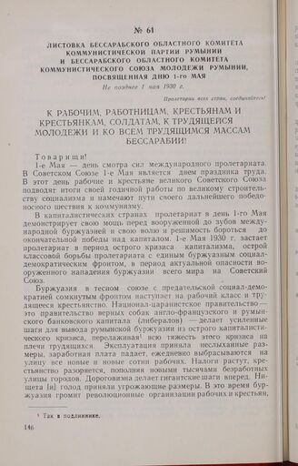 Листовка Бессарабского областного комитета Коммунистической партии Румынии и Бессарабского областного комитета Коммунистического Союза Молодежи Румынии, посвященная дню 1-го Мая. Не позднее 1 мая 1930 г.