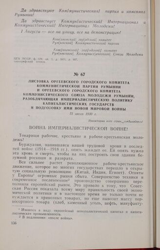 Листовка Оргеевского городского комитета Коммунистической партии Румынии и Оргеевского городского комитета Коммунистического Союза Молодежи Румынии, разоблачающая империалистическую политику капиталистических государств и подготовку ими новой миро...