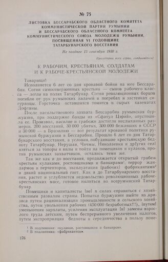 Листовка Бессарабского областного комитета Коммунистической партии Румынии и Бессарабского областного комитета Коммунистического Союза Молодежи Румынии, посвященная VI годовщине Татарбунарского восстания. Не позднее 15 сентября 1930 г. // ЦГА МССР, ф. 171, оп. 1, д. 25, л. 10, типографский оттиск.